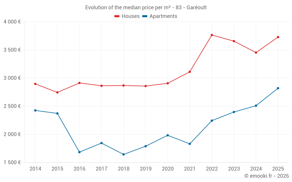 The median price on the 29 house transactions of the last 6 months in the municipality of Garéoult was 3 727 € per square meter for a median property value of 363 400 €. Over this period, 60% of transactions were between 2 934 and 4 316 € per square meter (from the 2nd to the 8th deciles).