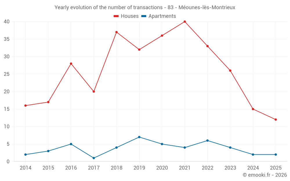The median price on the 25 house transactions of the last 12 months in the municipality of Méounes-lès-Montrieux was 3 350 € per square meter for a median property value of 328 000 €. Over this period, 60% of transactions were between 2 062 and 4 319 € per square meter (from the 2nd to the 8th deciles).