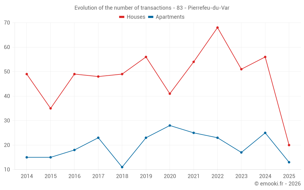 The median price on the 20 house transactions of the last 6 months in the municipality of Pierrefeu-du-Var was 3 903 € per square meter for a median property value of 479 950 €. Over this period, 60% of transactions were between 2 631 and 5 034 € per square meter (from the 2nd to the 8th deciles).