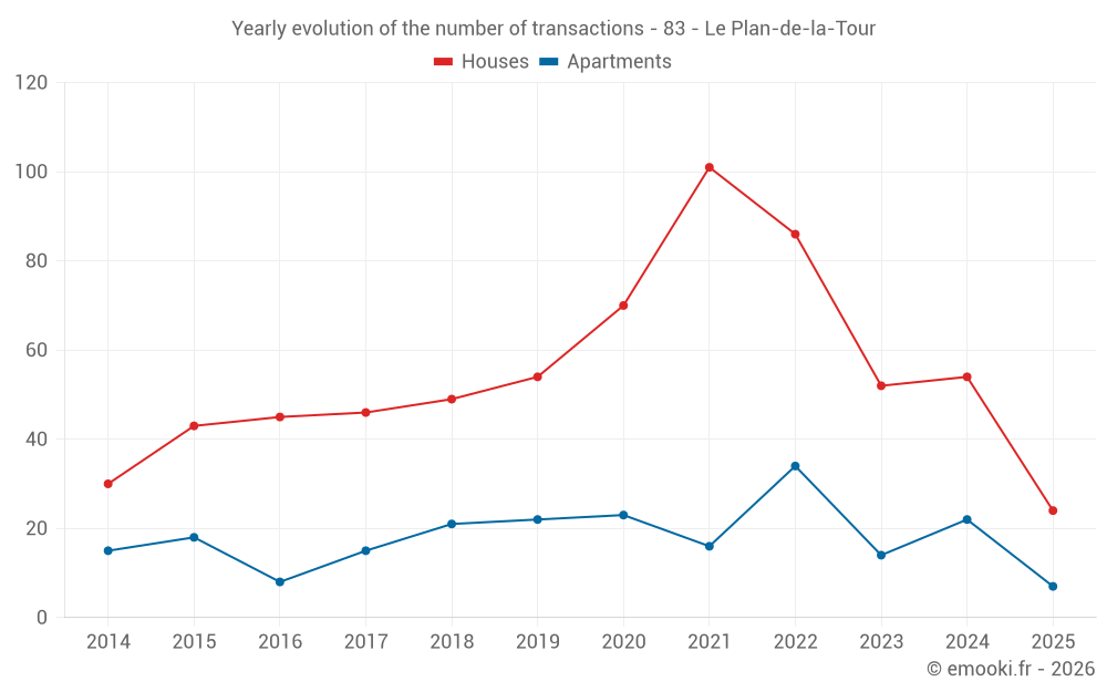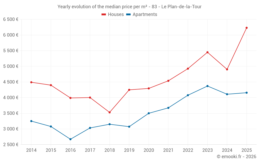 The median price on the 24 house transactions of the last 6 months in the municipality of Le Plan-de-la-Tour was 6 230 € per square meter for a median property value of 711 500 €. Over this period, 60% of transactions were between 4 059 and 7 380 € per square meter (from the 2nd to the 8th deciles).