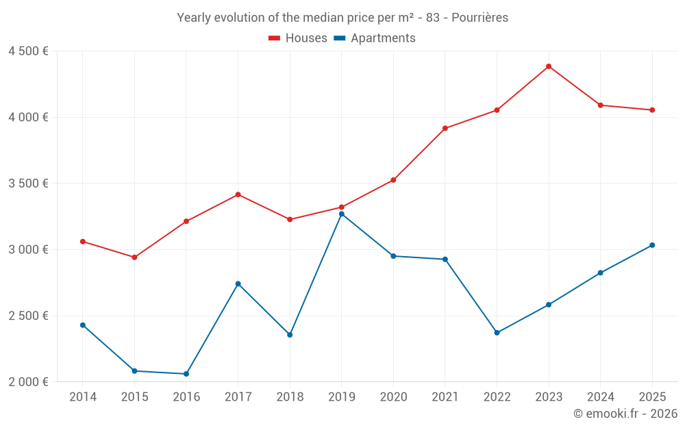 The median price on the 40 house transactions of the last 12 months in the municipality of Pourrières was 4 112 € per square meter for a median property value of 449 000 €. Over this period, 60% of transactions were between 3 175 and 5 019 € per square meter (from the 2nd to the 8th deciles).