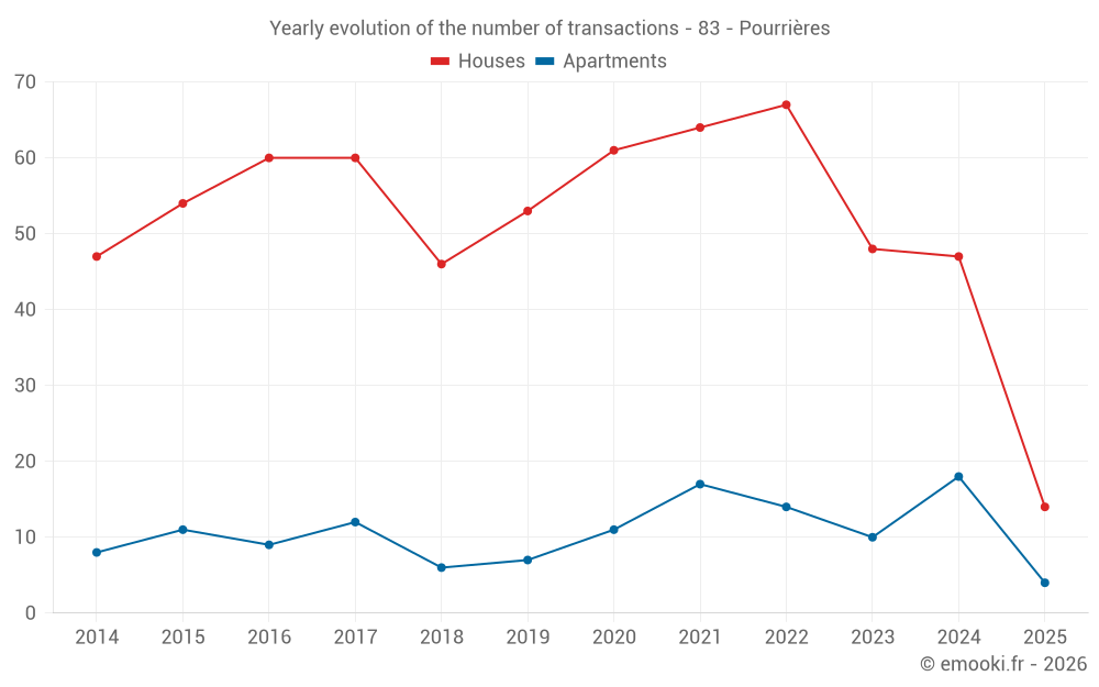 The median price on the 16 apartment transactions of the last 12 months in the municipality of Pourrières was 2 825 € per square meter for a median property value of 169 440 €. Over this period, 60% of transactions were between 1 094 and 3 636 € per square meter (from the 2nd to the 8th deciles).