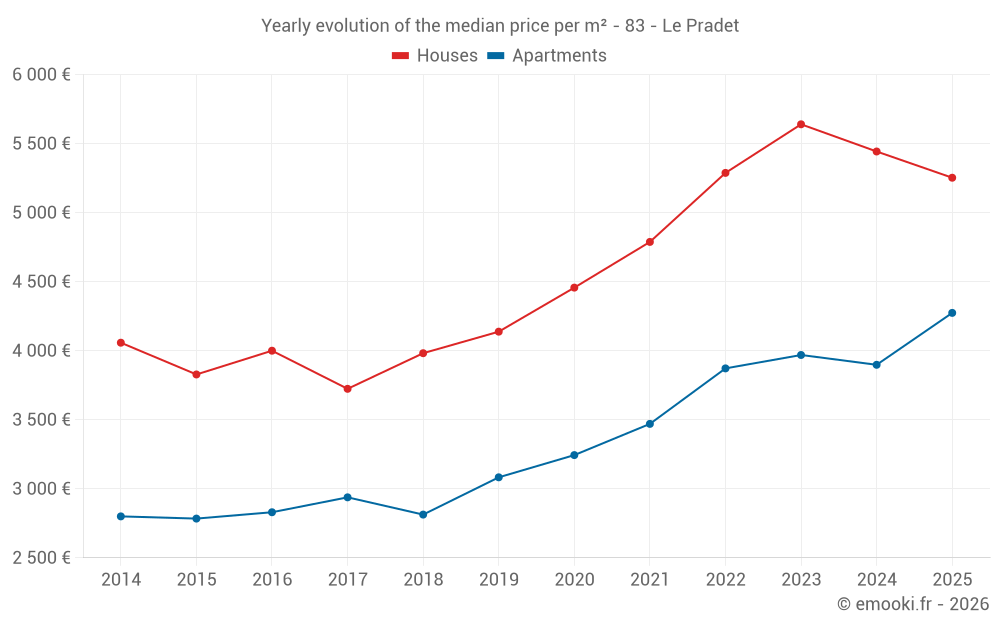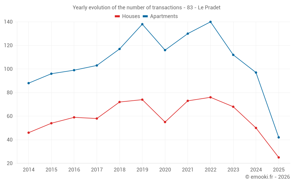 The median price on the 25 house transactions of the last 6 months in the municipality of Le Pradet was 5 253 € per square meter for a median property value of 549 626 €. Over this period, 60% of transactions were between 3 671 and 6 140 € per square meter (from the 2nd to the 8th deciles).