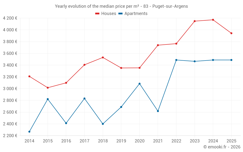 The median price on the 35 house transactions of the last 6 months in the municipality of Puget-sur-Argens was 3 943 € per square meter for a median property value of 380 000 €. Over this period, 60% of transactions were between 2 943 and 4 676 € per square meter (from the 2nd to the 8th deciles).