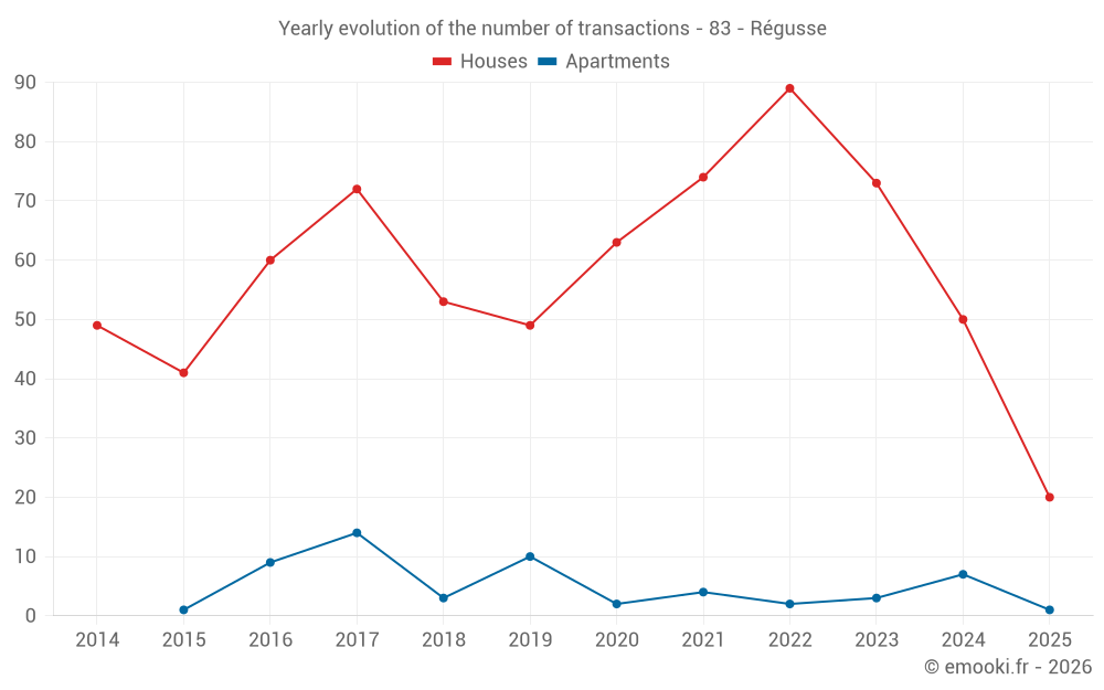 The median price on the 20 house transactions of the last 6 months in the municipality of Régusse was 3 162 € per square meter for a median property value of 251 500 €. Over this period, 60% of transactions were between 2 585 and 3 567 € per square meter (from the 2nd to the 8th deciles).