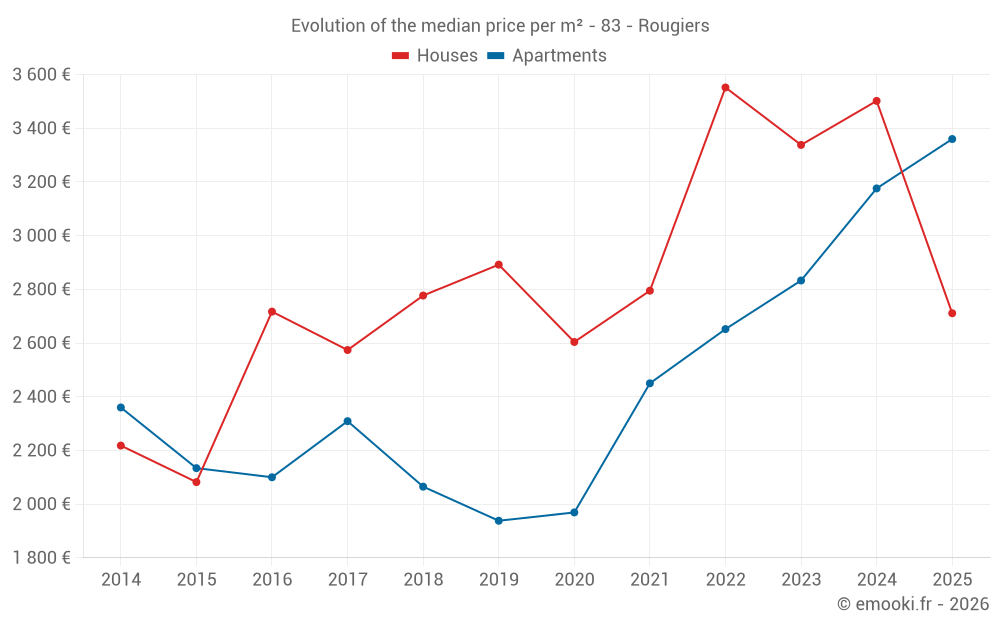 The median price on the 32 house transactions of the last 24 months in the municipality of Rougiers was 3 350 € per square meter for a median property value of 314 146 €. Over this period, 60% of transactions were between 1 935 and 3 834 € per square meter (from the 2nd to the 8th deciles).