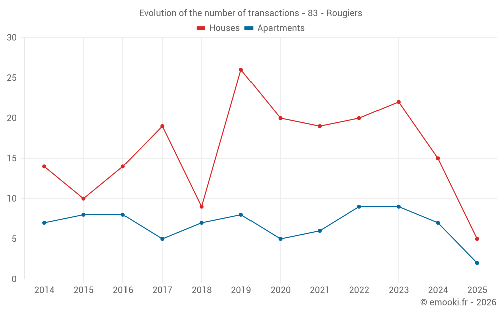 The median price on the 14 apartment transactions of the last 24 months in the municipality of Rougiers was 2 837 € per square meter for a median property value of 129 000 €. Over this period, 60% of transactions were between 1 906 and 3 710 € per square meter (from the 2nd to the 8th deciles).