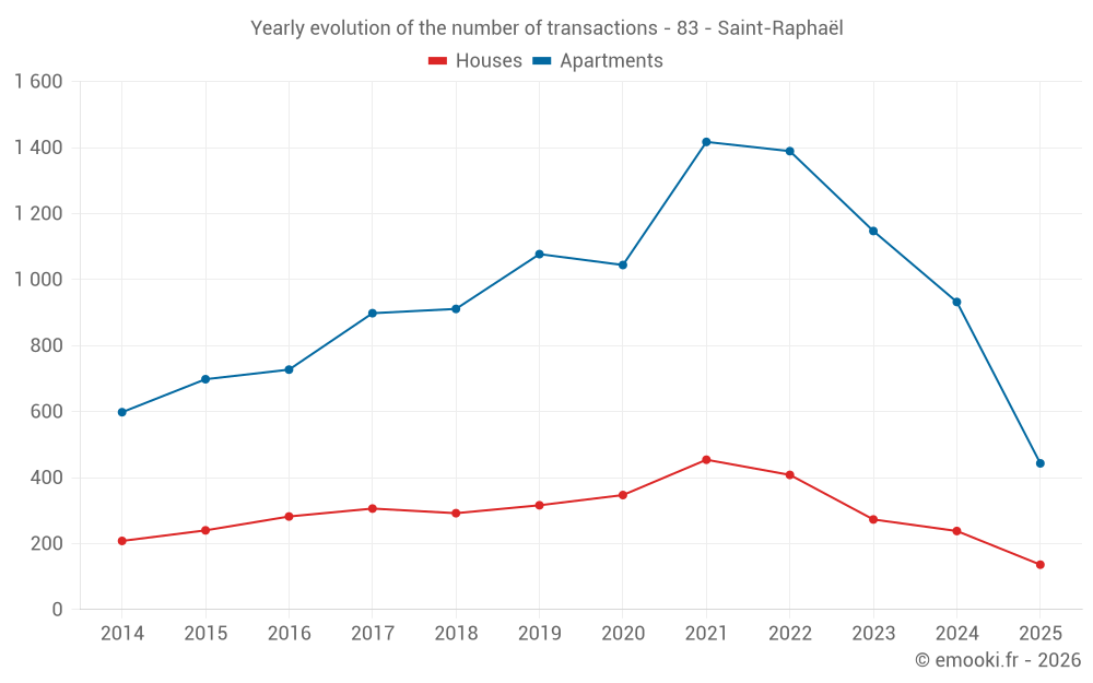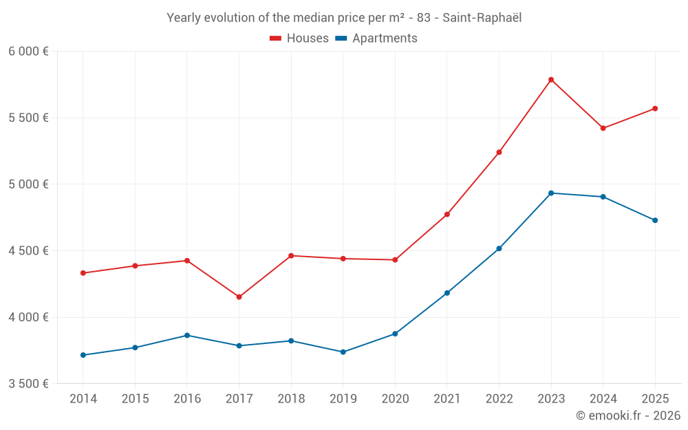 The median price on the 57 house transactions of the last 3 months in the municipality of Saint-Raphaël was 5 556 € per square meter for a median property value of 684 000 €. Over this period, 60% of transactions were between 4 204 and 7 801 € per square meter (from the 2nd to the 8th deciles).