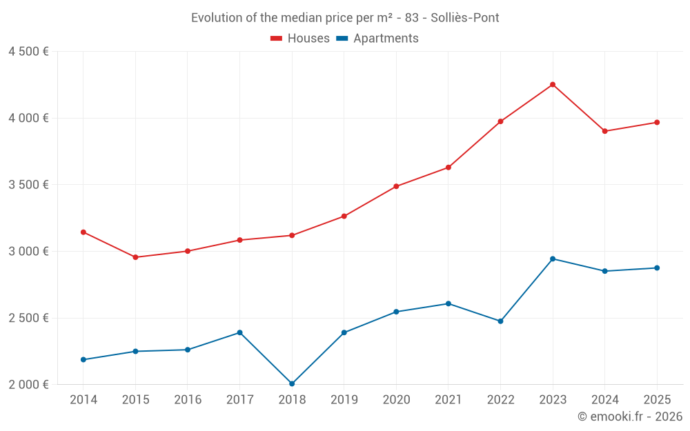 The median price on the 20 apartment transactions of the last 3 months in the municipality of Solliès-Pont was 2 854 € per square meter for a median property value of 197 800 €. Over this period, 60% of transactions were between 1 402 and 3 712 € per square meter (from the 2nd to the 8th deciles).