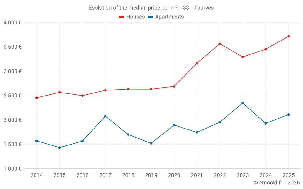 The median price on the 22 house transactions of the last 6 months in the municipality of Tourves was 3 716 € per square meter for a median property value of 341 375 €. Over this period, 60% of transactions were between 2 146 and 4 400 € per square meter (from the 2nd to the 8th deciles).