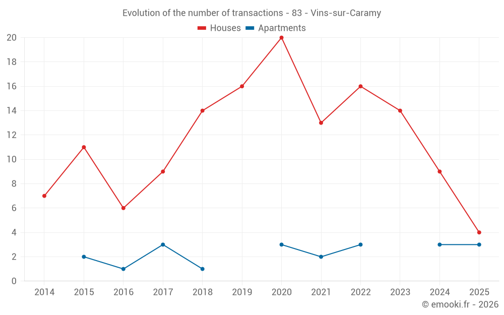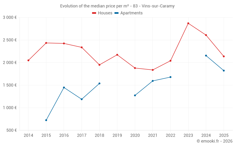 The median price on the 17 house transactions of the last 24 months in the municipality of Vins-sur-Caramy was 2 609 € per square meter for a median property value of 223 000 €. Over this period, 60% of transactions were between 1 431 and 3 025 € per square meter (from the 2nd to the 8th deciles).
