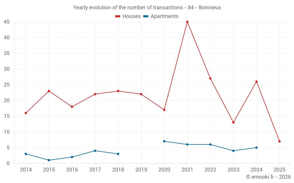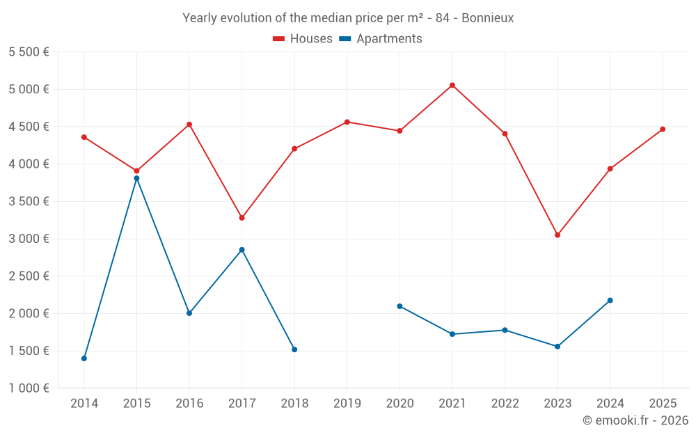The median price on the 21 house transactions of the last 12 months in the municipality of Bonnieux was 5 297 € per square meter for a median property value of 759 250 €. Over this period, 60% of transactions were between 2 634 and 8 718 € per square meter (from the 2nd to the 8th deciles).