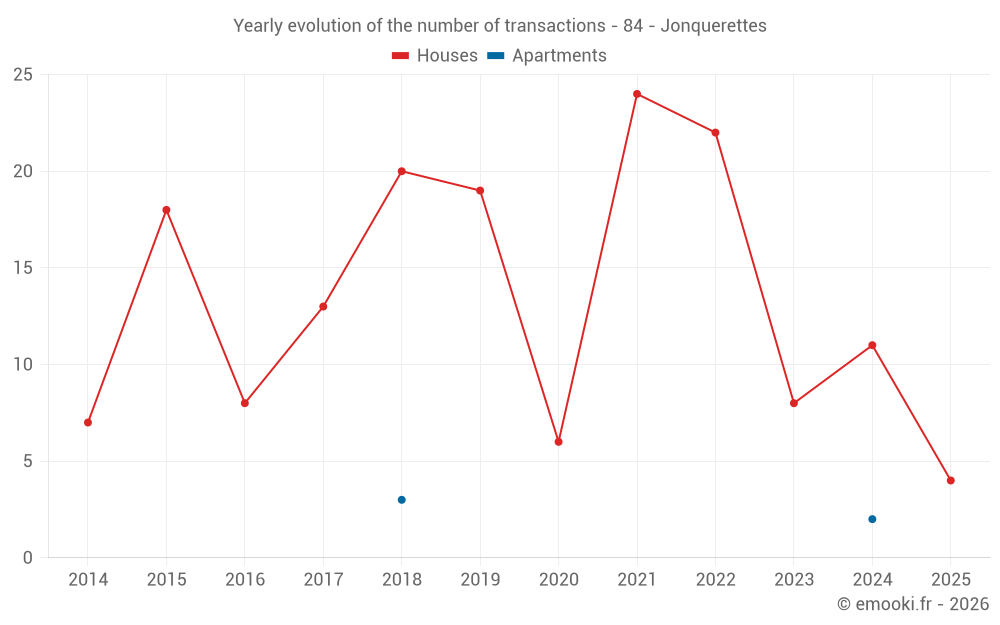 The median price on the 17 house transactions of the last 24 months in the municipality of Jonquerettes was 3 098 € per square meter for a median property value of 275 000 €. Over this period, 60% of transactions were between 2 596 and 3 726 € per square meter (from the 2nd to the 8th deciles).