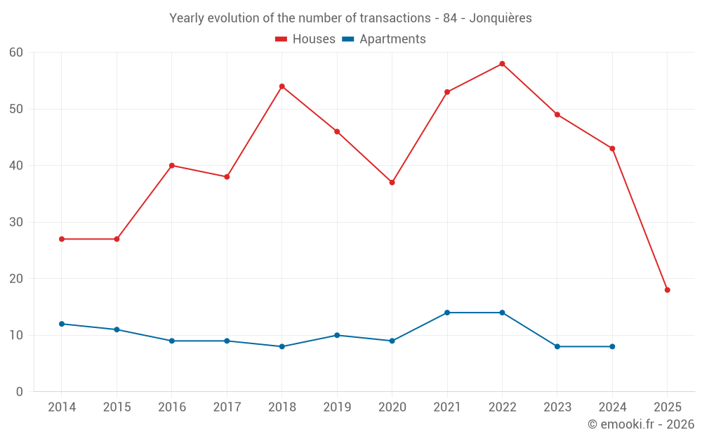 The median price on the 18 house transactions of the last 6 months in the municipality of Jonquières was 2 820 € per square meter for a median property value of 228 250 €. Over this period, 60% of transactions were between 1 507 and 3 403 € per square meter (from the 2nd to the 8th deciles).
