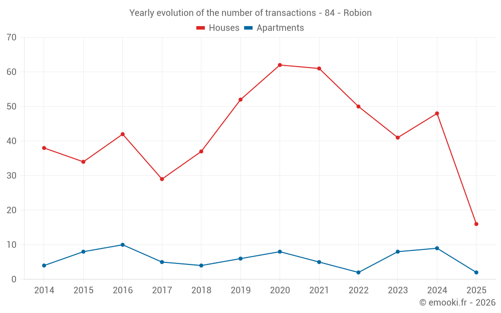 The median price on the 44 house transactions of the last 12 months in the municipality of Robion was 3 423 € per square meter for a median property value of 336 325 €. Over this period, 60% of transactions were between 2 738 and 4 542 € per square meter (from the 2nd to the 8th deciles).