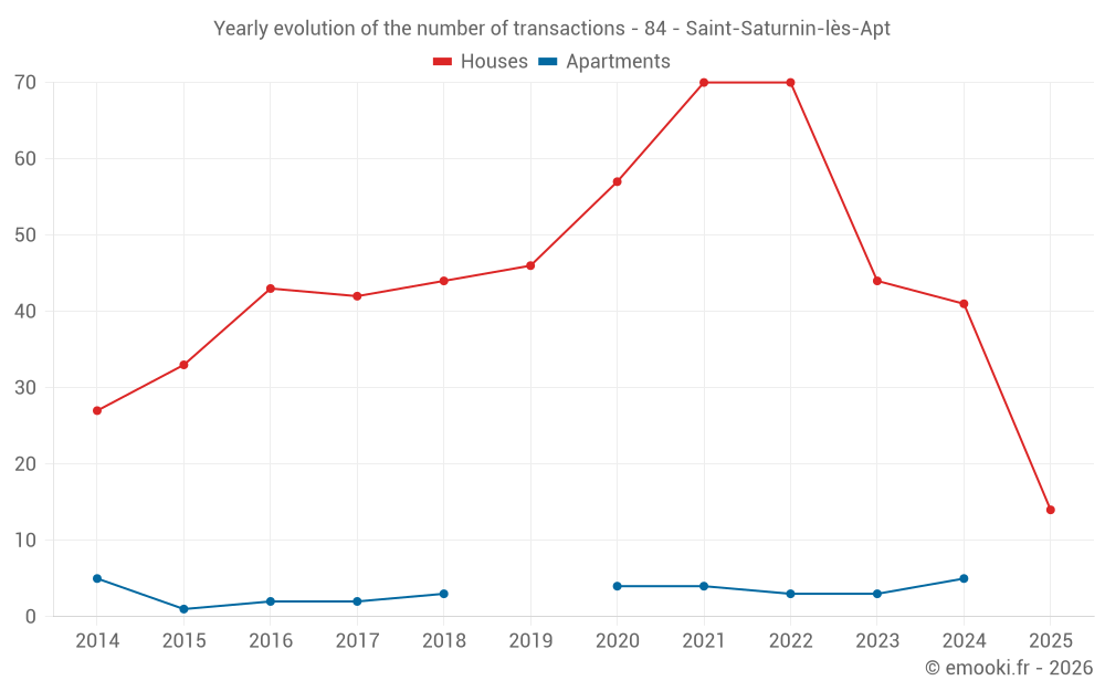 The median price on the 43 house transactions of the last 12 months in the municipality of Saint-Saturnin-lès-Apt was 3 684 € per square meter for a median property value of 383 670 €. Over this period, 60% of transactions were between 2 274 and 5 509 € per square meter (from the 2nd to the 8th deciles).
