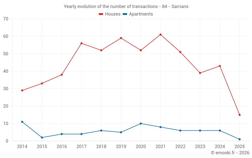The median price on the 43 house transactions of the last 12 months in the municipality of Sarrians was 2 538 € per square meter for a median property value of 233 000 €. Over this period, 60% of transactions were between 1 542 and 3 048 € per square meter (from the 2nd to the 8th deciles).