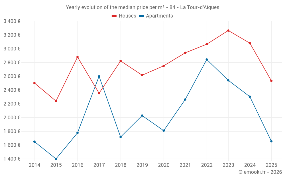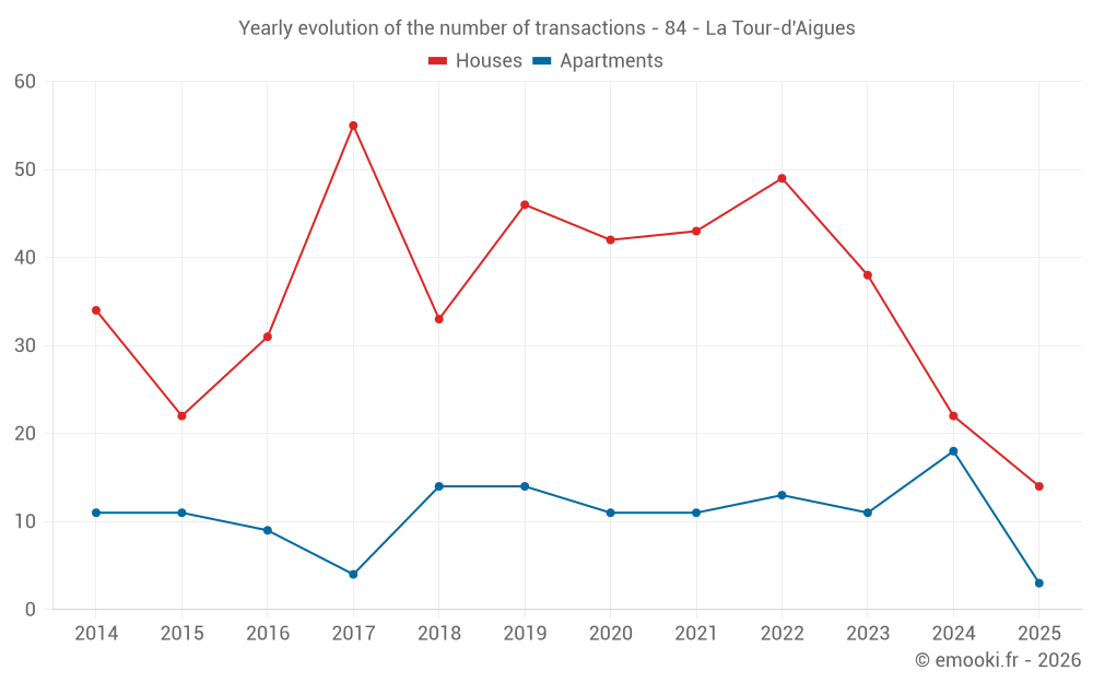 The median price on the 25 apartment transactions of the last 24 months in the municipality of La Tour-d'Aigues was 2 333 € per square meter for a median property value of 139 000 €. Over this period, 60% of transactions were between 1 819 and 3 044 € per square meter (from the 2nd to the 8th deciles).