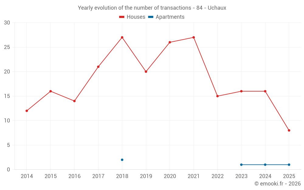 The median price on the 31 house transactions of the last 24 months in the municipality of Uchaux was 3 247 € per square meter for a median property value of 375 000 €. Over this period, 60% of transactions were between 2 451 and 3 951 € per square meter (from the 2nd to the 8th deciles).