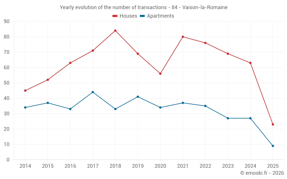 The median price on the 23 house transactions of the last 6 months in the municipality of Vaison-la-Romaine was 3 538 € per square meter for a median property value of 310 000 €. Over this period, 60% of transactions were between 2 938 and 4 320 € per square meter (from the 2nd to the 8th deciles).