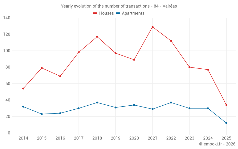 The median price on the 32 apartment transactions of the last 12 months in the municipality of Valréas was 1 226 € per square meter for a median property value of 82 025 €. Over this period, 60% of transactions were between 701 and 2 054 € per square meter (from the 2nd to the 8th deciles).