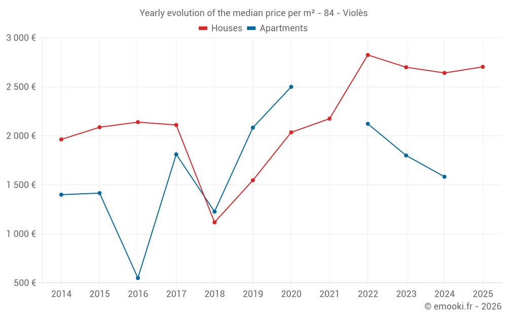 The median price on the 17 house transactions of the last 12 months in the municipality of Violès was 2 704 € per square meter for a median property value of 263 000 €. Over this period, 60% of transactions were between 1 764 and 3 153 € per square meter (from the 2nd to the 8th deciles).