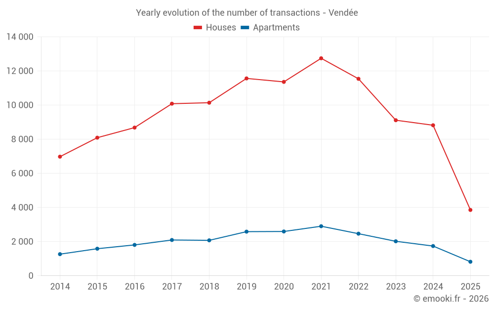 The median price on the 1742 house transactions of the last 3 months in the Vendée department was 2 366 € per square meter for a median property value of 215 000 €. Over this period, 60% of transactions were between 1 519 and 3 450 € per square meter (from the 2nd to the 8th deciles).