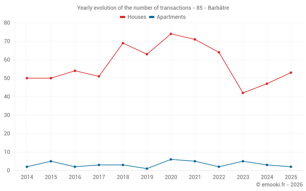 The median price on the 20 house transactions of the last 3 months in the municipality of Barbâtre was 3 600 € per square meter for a median property value of 273 505 €. Over this period, 60% of transactions were between 2 904 and 4 094 € per square meter (from the 2nd to the 8th deciles).