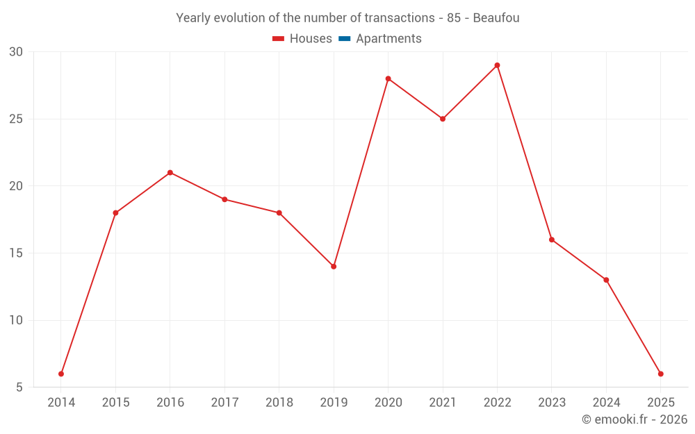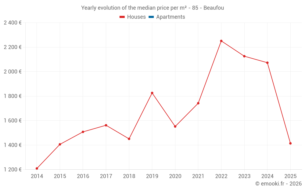 The median price on the 16 house transactions of the last 12 months in the municipality of Beaufou was 1 697 € per square meter for a median property value of 219 890 €. Over this period, 60% of transactions were between 1 250 and 2 391 € per square meter (from the 2nd to the 8th deciles).