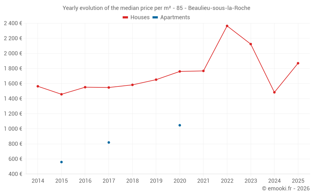 The median price on the 23 house transactions of the last 12 months in the municipality of Beaulieu-sous-la-Roche was 1 823 € per square meter for a median property value of 175 000 €. Over this period, 60% of transactions were between 1 380 and 2 431 € per square meter (from the 2nd to the 8th deciles).
