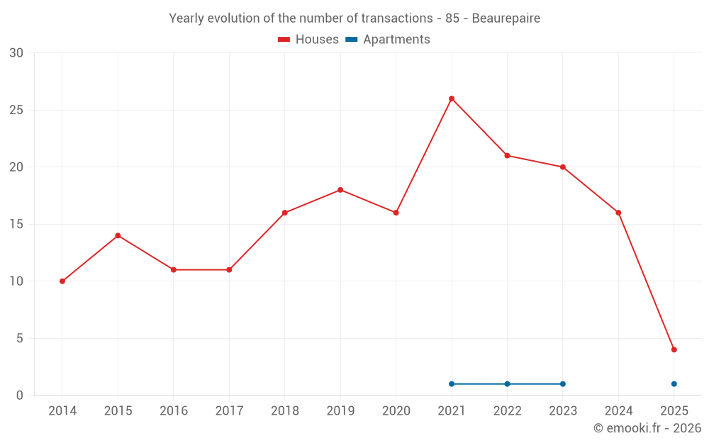 The median price on the 27 house transactions of the last 24 months in the municipality of Beaurepaire was 1 864 € per square meter for a median property value of 178 500 €. Over this period, 60% of transactions were between 1 552 and 2 383 € per square meter (from the 2nd to the 8th deciles).