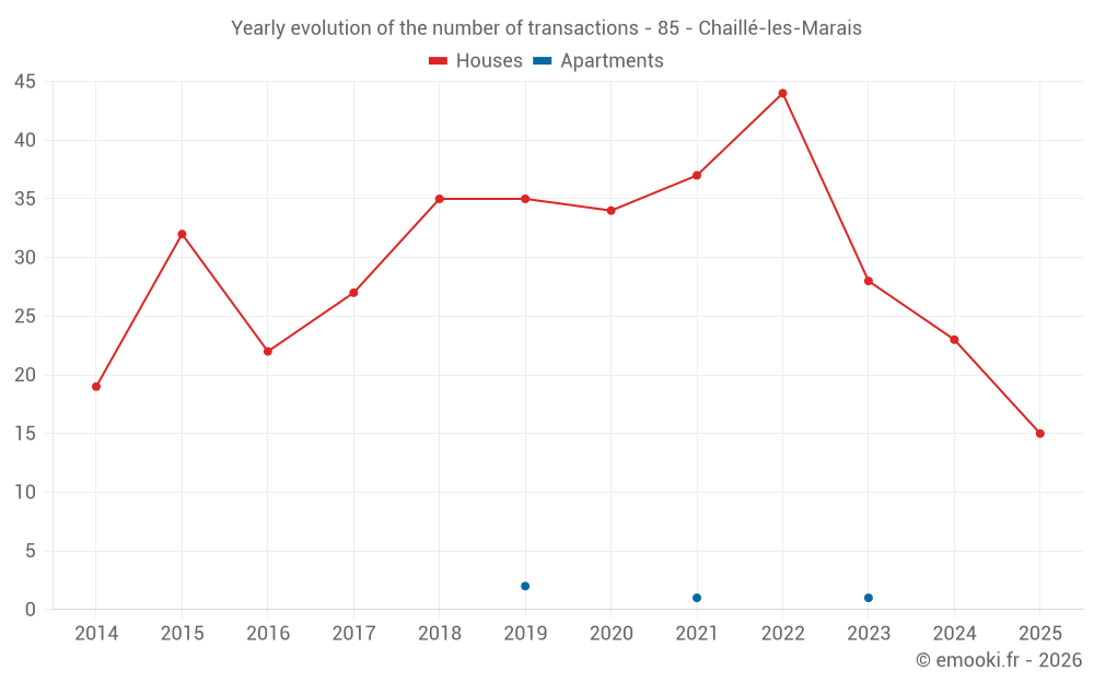 The median price on the 31 house transactions of the last 12 months in the municipality of Chaillé-les-Marais was 1 610 € per square meter for a median property value of 167 451 €. Over this period, 60% of transactions were between 1 143 and 2 203 € per square meter (from the 2nd to the 8th deciles).