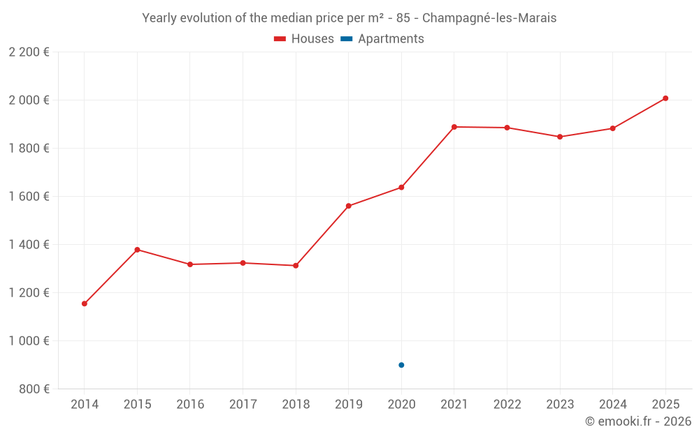 The median price on the 19 house transactions of the last 12 months in the municipality of Champagné-les-Marais was 2 008 € per square meter for a median property value of 182 000 €. Over this period, 60% of transactions were between 1 268 and 2 628 € per square meter (from the 2nd to the 8th deciles).