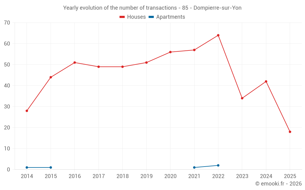 The median price on the 18 house transactions of the last 6 months in the municipality of Dompierre-sur-Yon was 2 138 € per square meter for a median property value of 224 000 €. Over this period, 60% of transactions were between 1 814 and 2 441 € per square meter (from the 2nd to the 8th deciles).