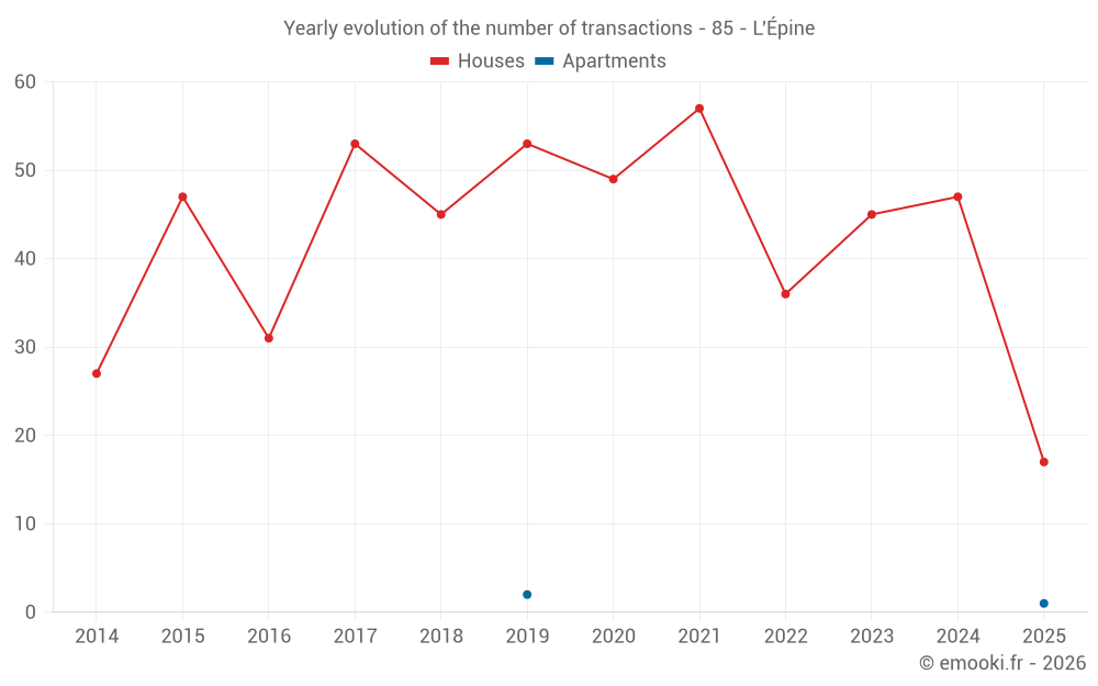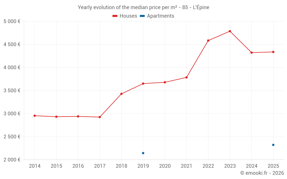The median price on the 46 house transactions of the last 12 months in the municipality of L'Épine was 4 318 € per square meter for a median property value of 353 000 €. Over this period, 60% of transactions were between 3 482 and 5 625 € per square meter (from the 2nd to the 8th deciles).