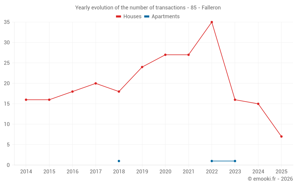 The median price on the 16 house transactions of the last 12 months in the municipality of Falleron was 2 172 € per square meter for a median property value of 183 800 €. Over this period, 60% of transactions were between 1 958 and 2 400 € per square meter (from the 2nd to the 8th deciles).