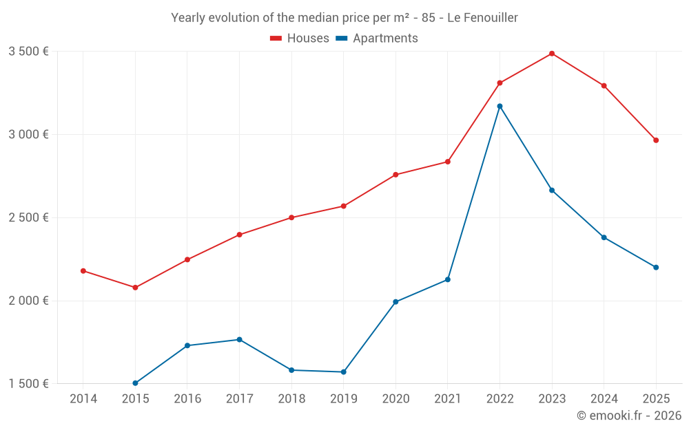The median price on the 25 house transactions of the last 6 months in the municipality of Le Fenouiller was 2 965 € per square meter for a median property value of 278 500 €. Over this period, 60% of transactions were between 2 461 and 3 607 € per square meter (from the 2nd to the 8th deciles).