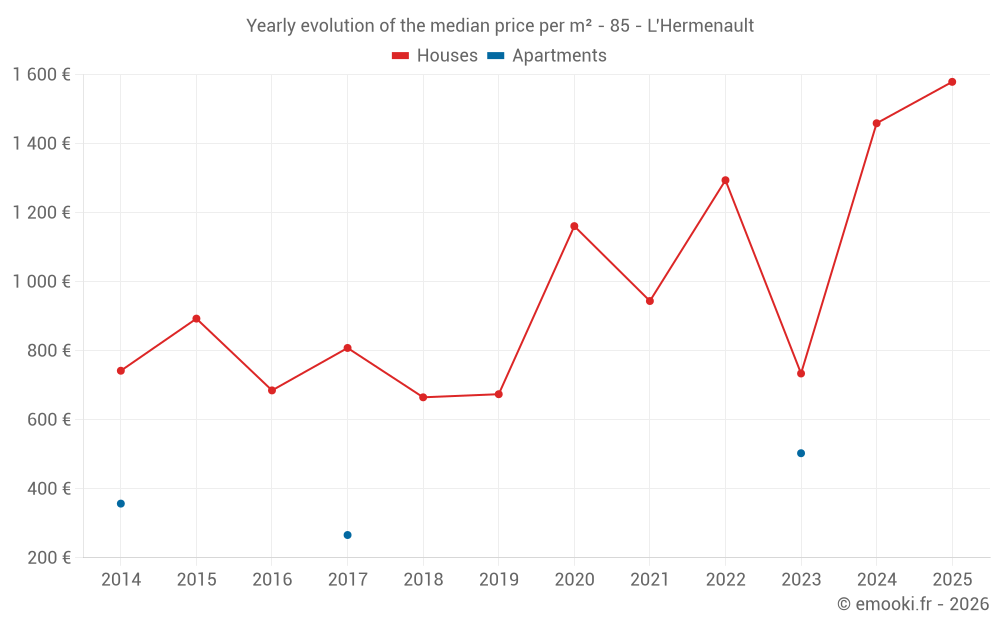 The median price on the 19 house transactions of the last 12 months in the municipality of L'Hermenault was 1 460 € per square meter for a median property value of 140 000 €. Over this period, 60% of transactions were between 1 110 and 1 660 € per square meter (from the 2nd to the 8th deciles).