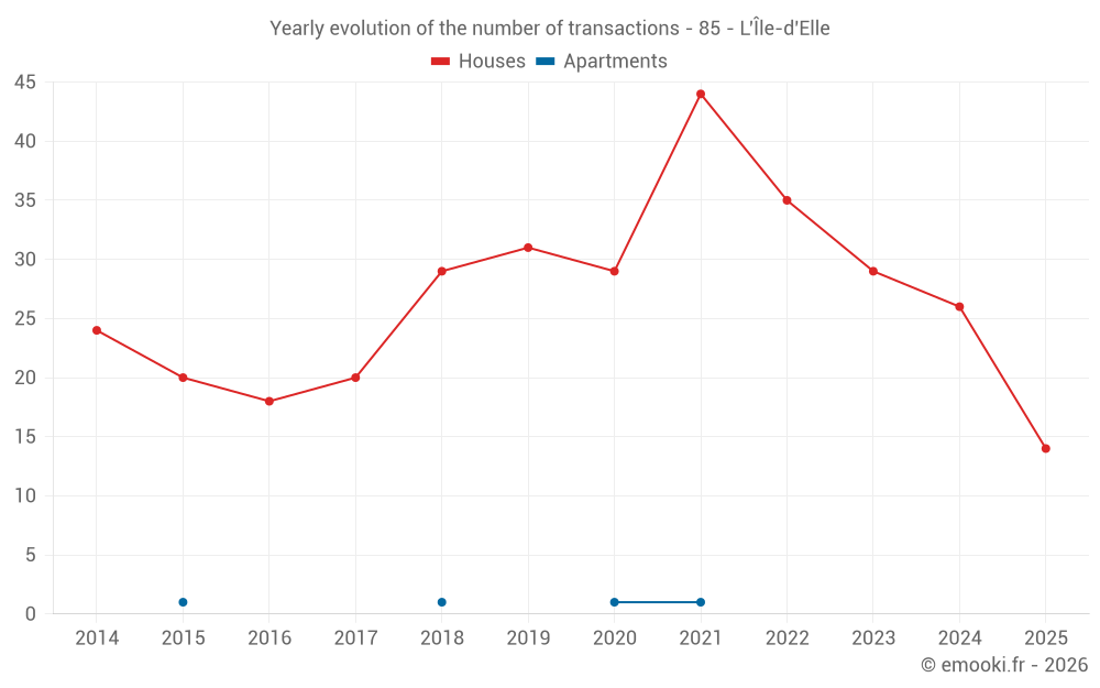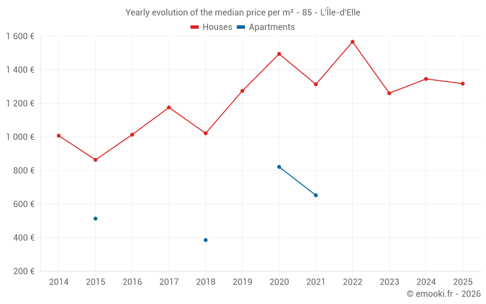 The median price on the 27 house transactions of the last 12 months in the municipality of L'Île-d'Elle was 1 326 € per square meter for a median property value of 125 000 €. Over this period, 60% of transactions were between 873 and 1 954 € per square meter (from the 2nd to the 8th deciles).