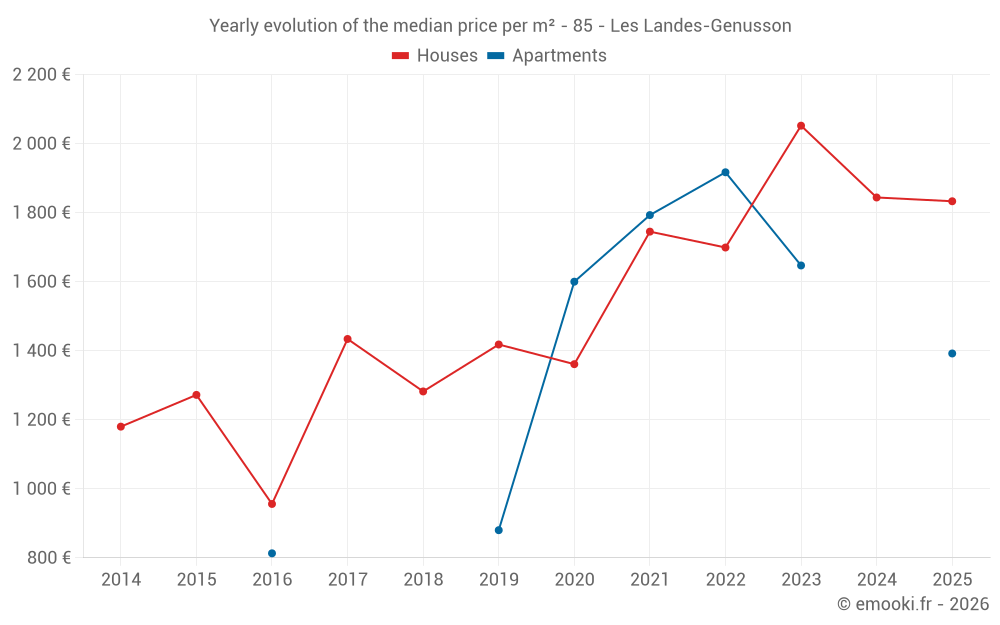The median price on the 21 house transactions of the last 12 months in the municipality of Les Landes-Genusson was 1 880 € per square meter for a median property value of 196 000 €. Over this period, 60% of transactions were between 1 369 and 2 358 € per square meter (from the 2nd to the 8th deciles).