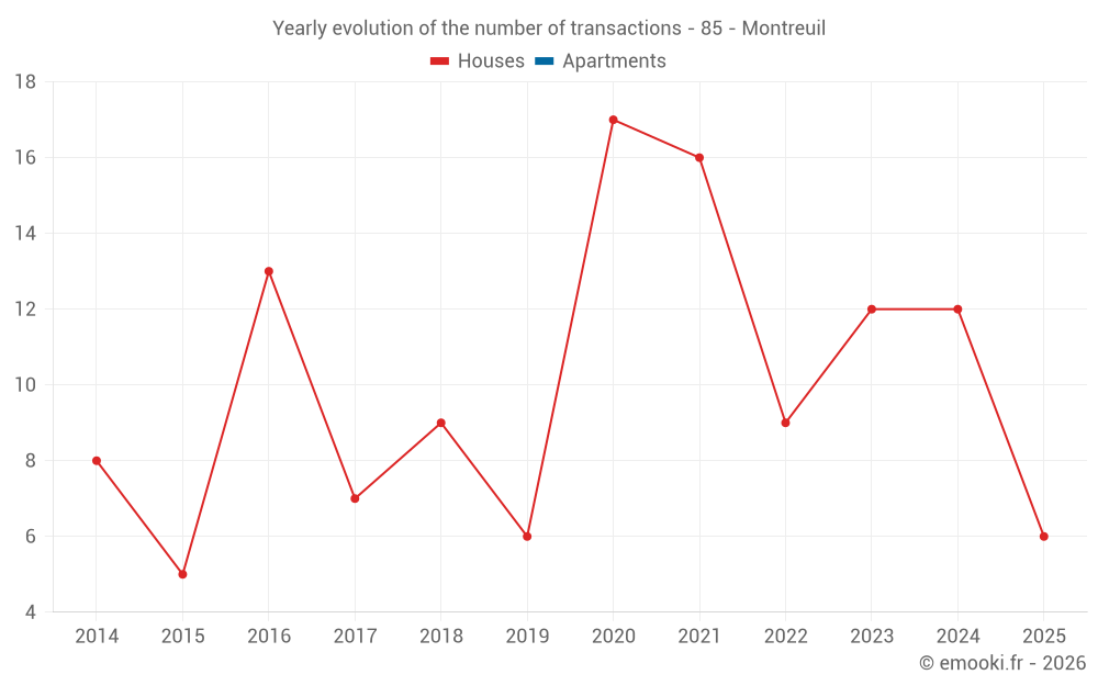 The median price on the 23 house transactions of the last 24 months in the municipality of Montreuil was 1 322 € per square meter for a median property value of 163 000 €. Over this period, 60% of transactions were between 973 and 1 876 € per square meter (from the 2nd to the 8th deciles).