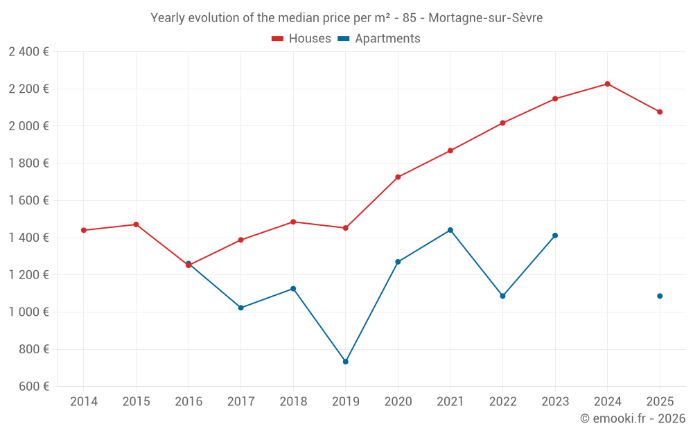 The median price on the 22 house transactions of the last 6 months in the municipality of Mortagne-sur-Sèvre was 2 076 € per square meter for a median property value of 226 000 €. Over this period, 60% of transactions were between 1 525 and 2 516 € per square meter (from the 2nd to the 8th deciles).