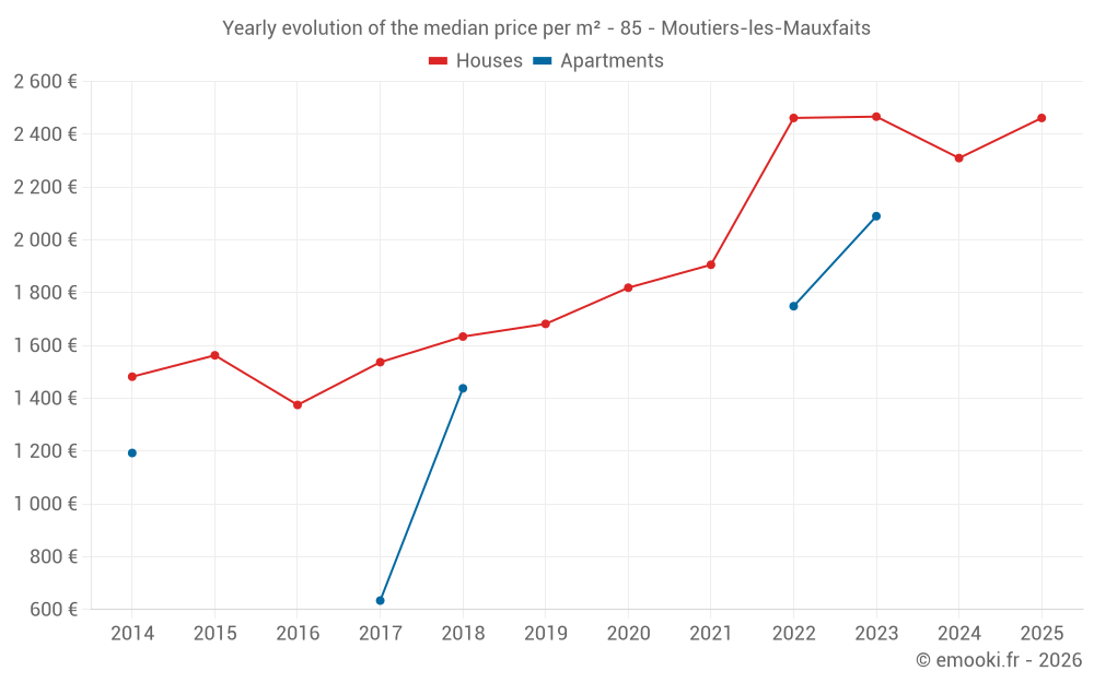 The median price on the 22 house transactions of the last 12 months in the municipality of Moutiers-les-Mauxfaits was 2 412 € per square meter for a median property value of 199 000 €. Over this period, 60% of transactions were between 2 036 and 2 918 € per square meter (from the 2nd to the 8th deciles).