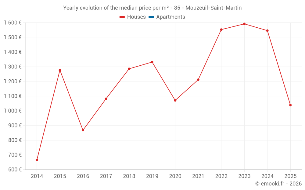 The median price on the 20 house transactions of the last 12 months in the municipality of Mouzeuil-Saint-Martin was 1 386 € per square meter for a median property value of 168 750 €. Over this period, 60% of transactions were between 1 000 and 2 077 € per square meter (from the 2nd to the 8th deciles).