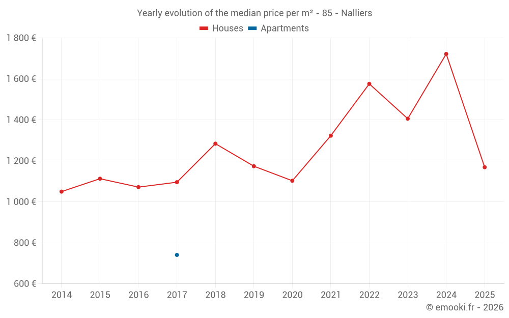The median price on the 29 house transactions of the last 12 months in the municipality of Nalliers was 1 389 € per square meter for a median property value of 150 000 €. Over this period, 60% of transactions were between 724 and 2 114 € per square meter (from the 2nd to the 8th deciles).