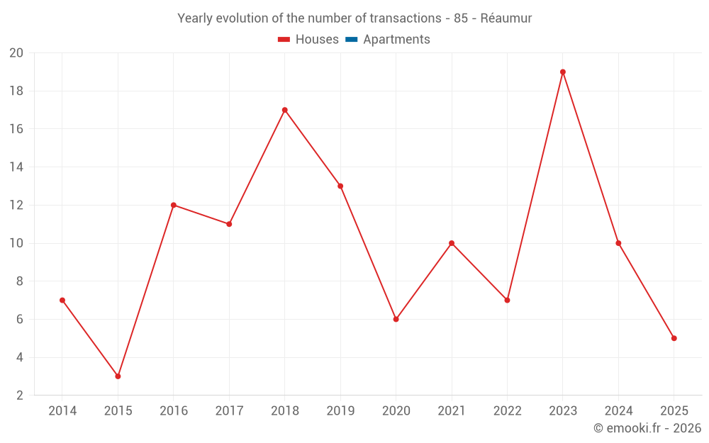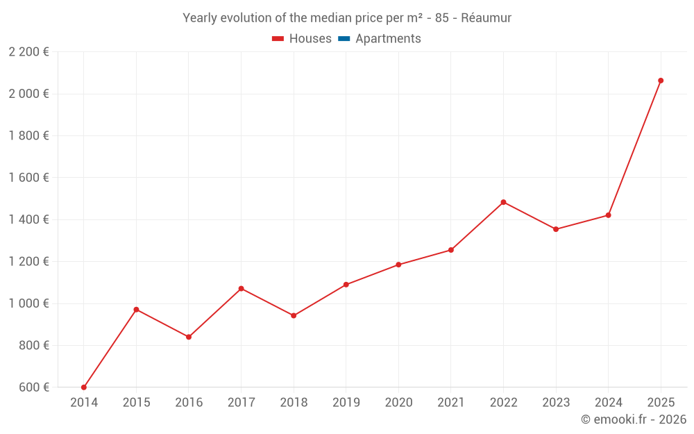 The median price on the 26 house transactions of the last 24 months in the municipality of Réaumur was 1 400 € per square meter for a median property value of 135 000 €. Over this period, 60% of transactions were between 653 and 1 724 € per square meter (from the 2nd to the 8th deciles).