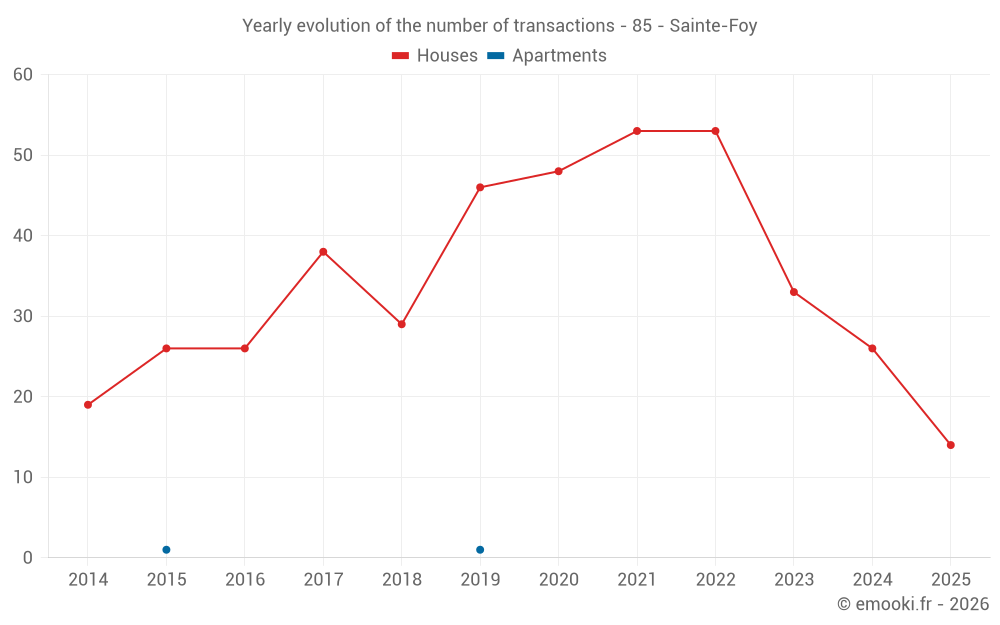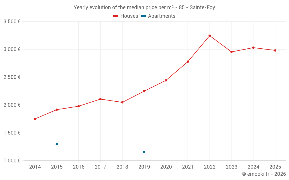 The median price on the 24 house transactions of the last 12 months in the municipality of Sainte-Foy was 2 980 € per square meter for a median property value of 290 000 €. Over this period, 60% of transactions were between 2 387 and 3 677 € per square meter (from the 2nd to the 8th deciles).