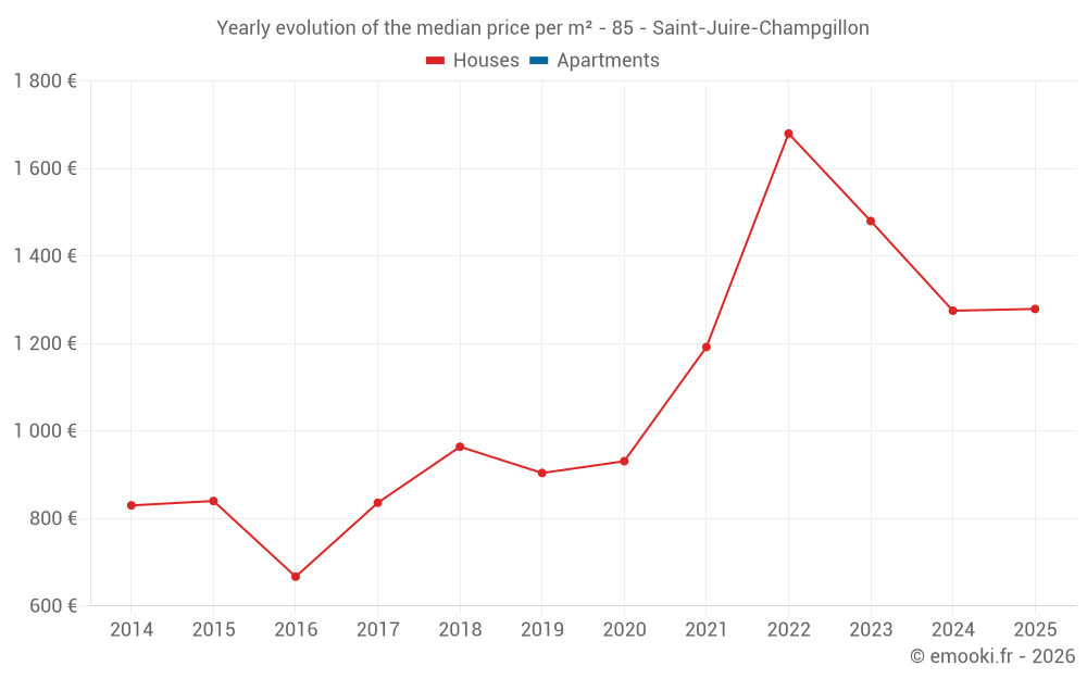 The median price on the 21 house transactions of the last 24 months in the municipality of Saint-Juire-Champgillon was 1 275 € per square meter for a median property value of 110 000 €. Over this period, 60% of transactions were between 842 and 1 967 € per square meter (from the 2nd to the 8th deciles).