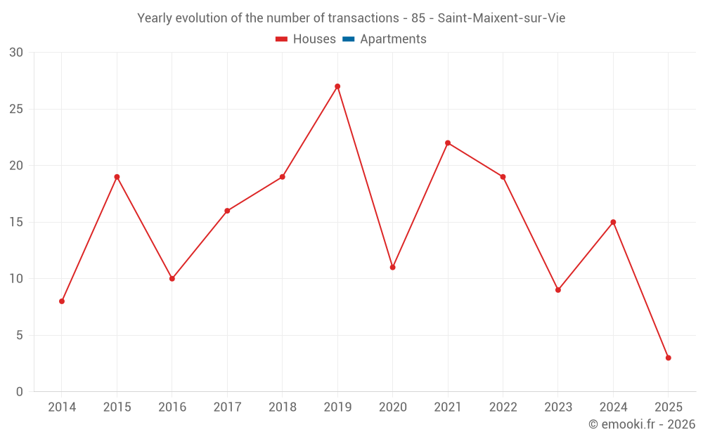 The median price on the 20 house transactions of the last 24 months in the municipality of Saint-Maixent-sur-Vie was 2 336 € per square meter for a median property value of 237 900 €. Over this period, 60% of transactions were between 2 059 and 2 872 € per square meter (from the 2nd to the 8th deciles).