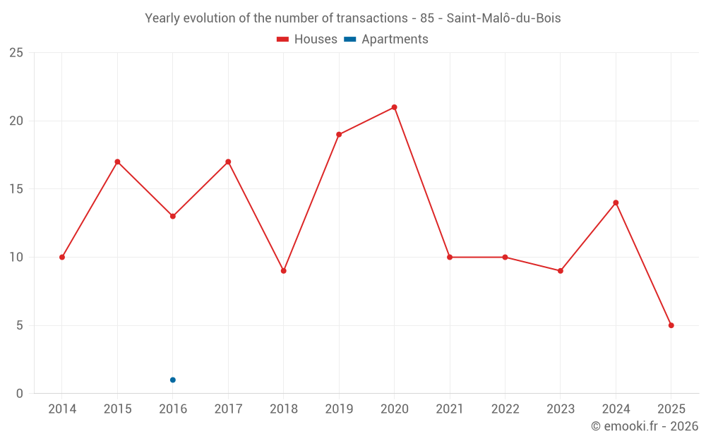 The median price on the 26 house transactions of the last 24 months in the municipality of Saint-Malô-du-Bois was 1 948 € per square meter for a median property value of 189 682 €. Over this period, 60% of transactions were between 1 650 and 2 356 € per square meter (from the 2nd to the 8th deciles).